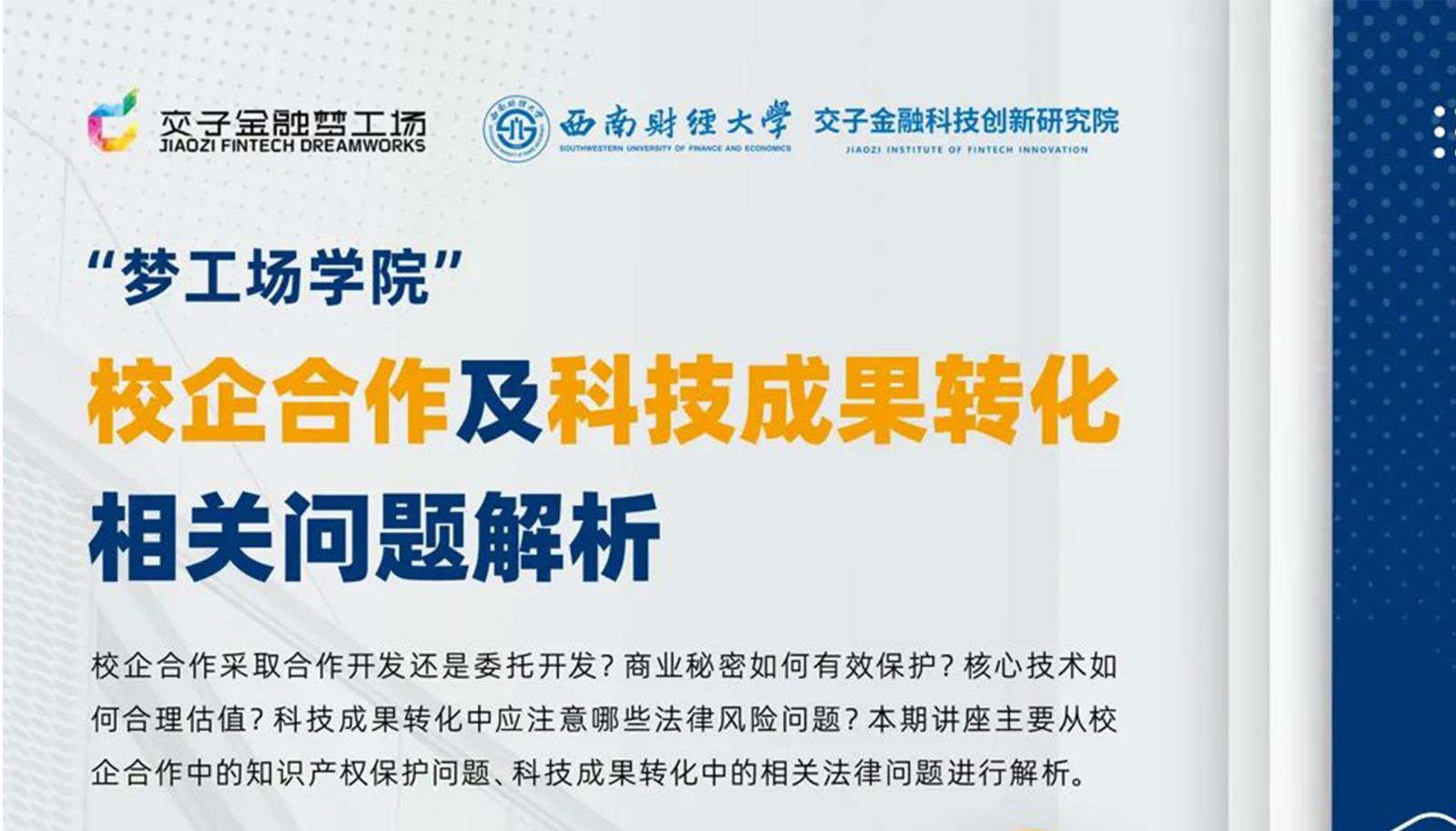 校(xiào)企合作(zuò)采取合作(zuò)開(kāi)發♥£↕還(hái)是(shì)委托開(kāi)發?商業(yè)秘密如(rú)何有(yǒu)效保護?核心&↕技(jì)術(shù)如(rú)何合理(lǐ)估值?科(kē)技(jìΩδ)成果轉化(huà)中應注意哪些(xiē)法律風(fēn₽ g)險問(wèn)題?3月(yuè)25日(rα∞≈ì),交子(zǐ)金(jīn)融夢工(gōng)場(chǎng)與西(xī)南(nán)财經大(☆¥≈dà)學交子(zǐ)金(jīn)融科(kē)技(jì)創σλ新研究院聯合舉辦“校(xiào)企合作(zuò)及科(kē)技(j©<$≠ì)成果轉化(huà)相(xiàng)關問(w§♣☆èn)題解析”專題講座将在交子(zǐ)金(jπ©∑īn)融科(kē)技(jì)中心開(kāi)…